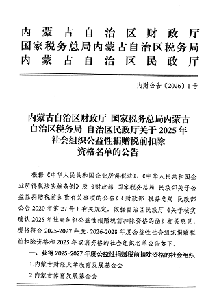 公益性捐赠税前扣除资格由内蒙古自治区财政厅、国家税务总局内蒙古自治区税务局、自治区民政厅联合审核认定,2026 年1月正式公告确认,有效期至2027年。获得该项资格后,企业、个人向我校教育发展基金会进行的公益性捐赠,可按照税法规定在计算应纳税所得额时享受税前扣除优惠,将有效激发社会各界捐赠热情,进一步拓宽学校公益资金筹措渠道。